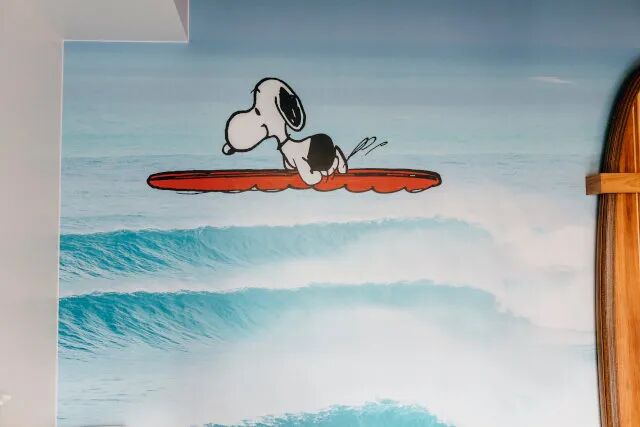不仅有漫画涂鸦,墙上还真的挂了一块冲浪板哦。
