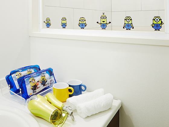 不仅墙上有小黄人,电视上、镜子上都有它们的身影,尽显搞怪天性。