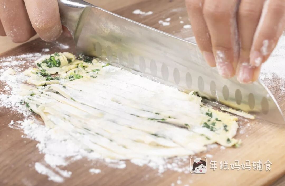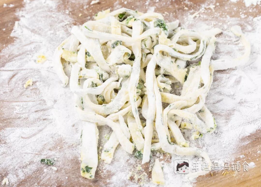 把蔬菜和炒熟的鸡蛋夹到饺子皮之间,再擀一擀,切一切,馅料都夹在了面条里,完美的融为一体,营养密度更高了。