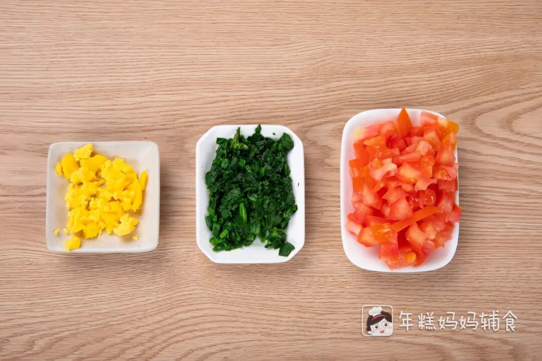 2.菠菜焯水切碎,鸡蛋煮熟取蛋黄,捣碎,西红柿切块;