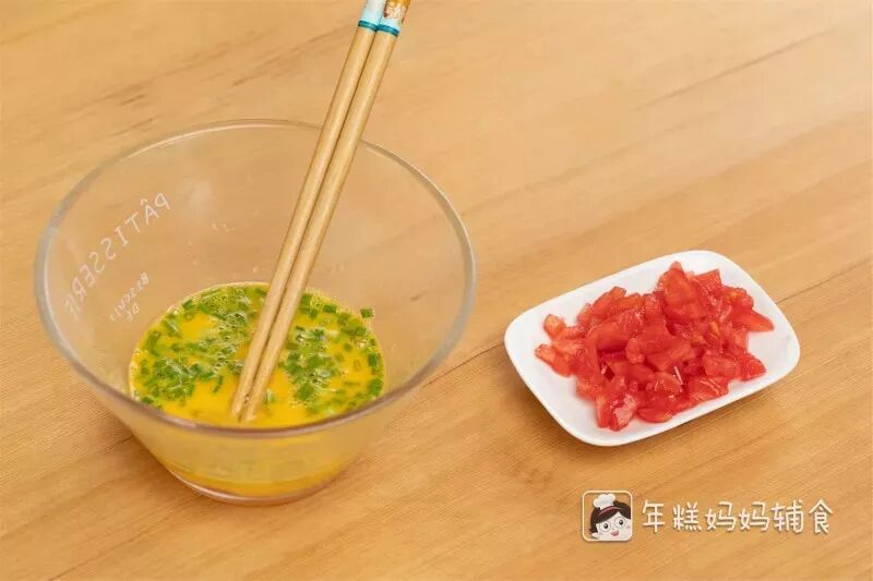 2.小葱切葱花,鸡蛋打入碗中搅散,加入小葱拌匀,西红柿去皮切丁备用;(小葱有人喜欢有人烦,如果不习惯不加也可以的哈)