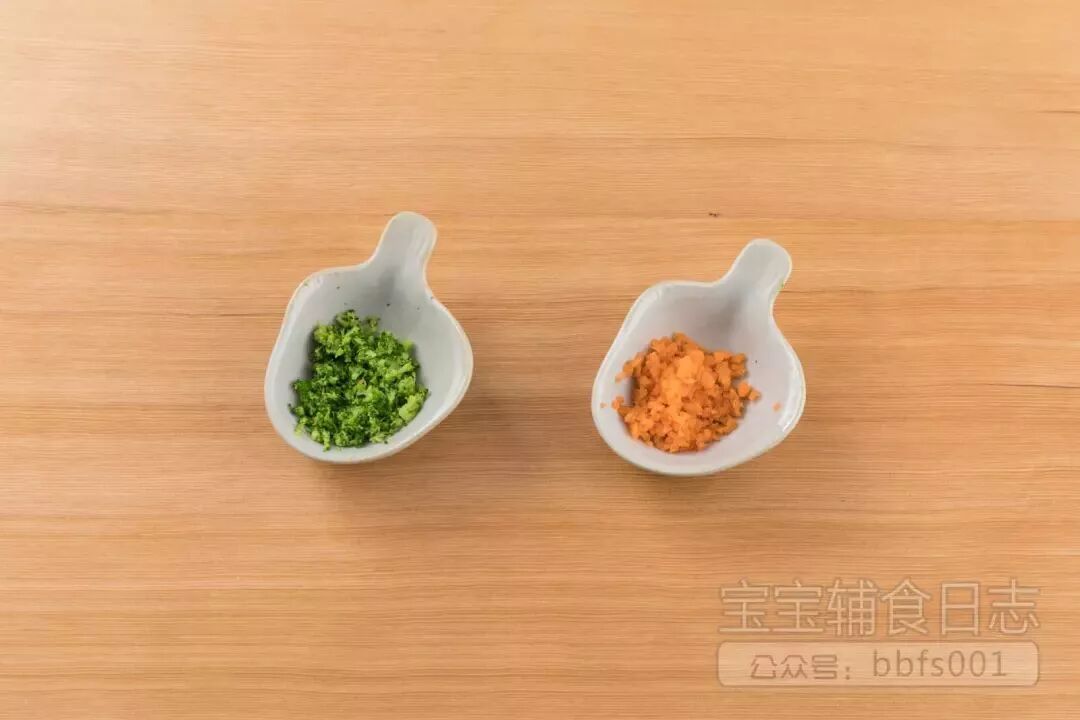 4.西蓝花洗净焯水,取花茸部分剁碎;胡萝卜洗净去皮,焯水后切成碎末;