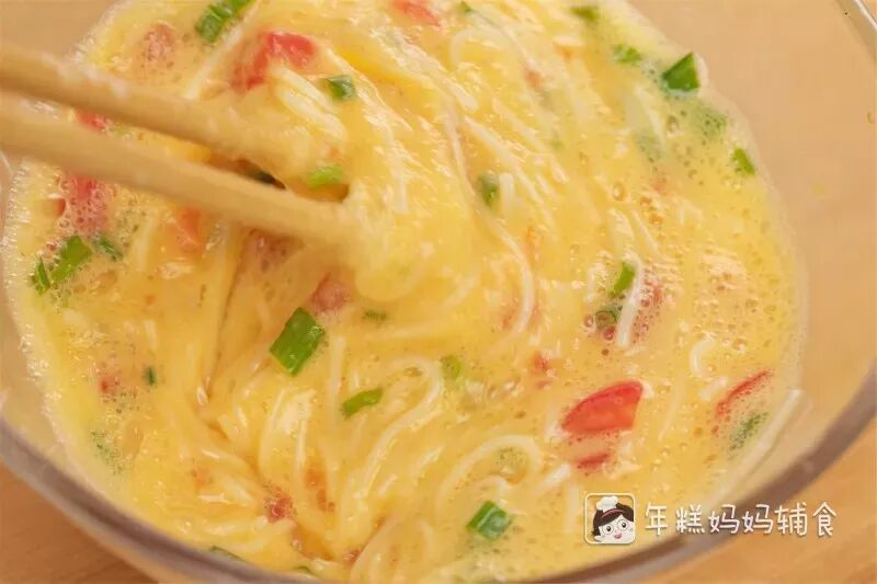 4.将面条、西红柿丁放入鸡蛋液中,用筷子拌匀;