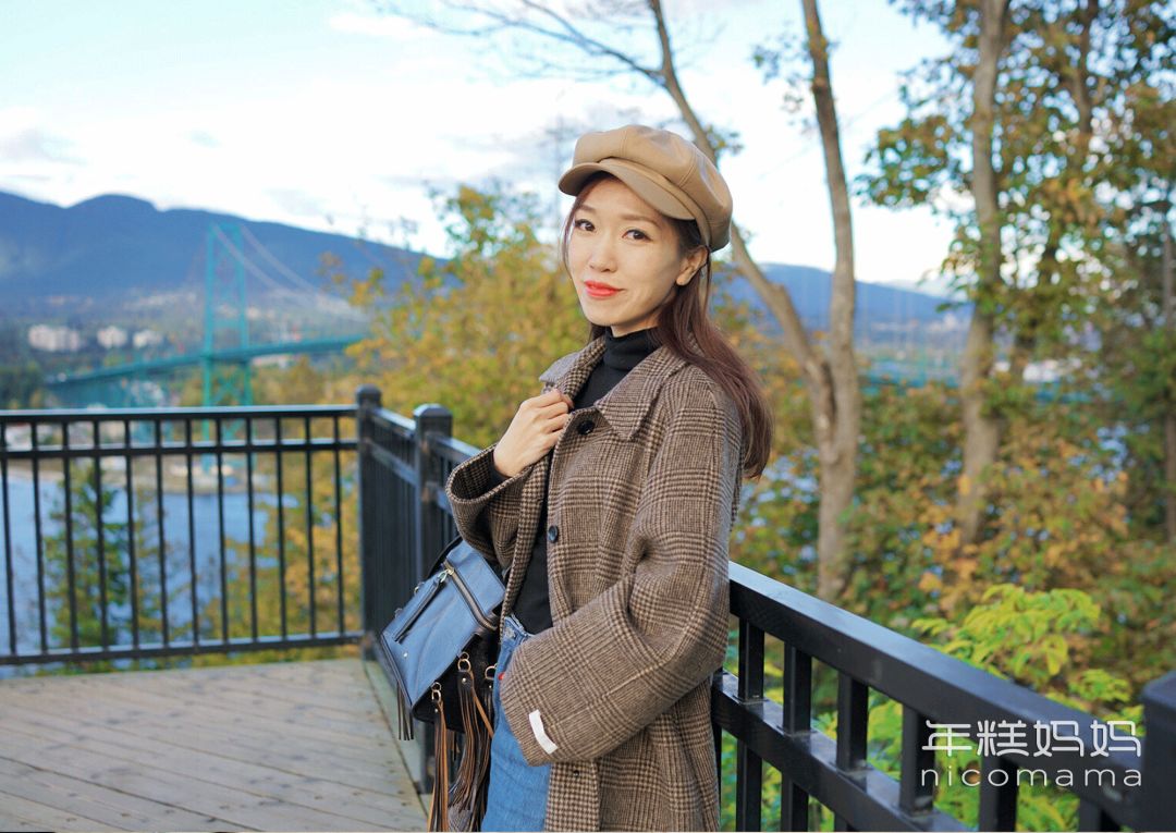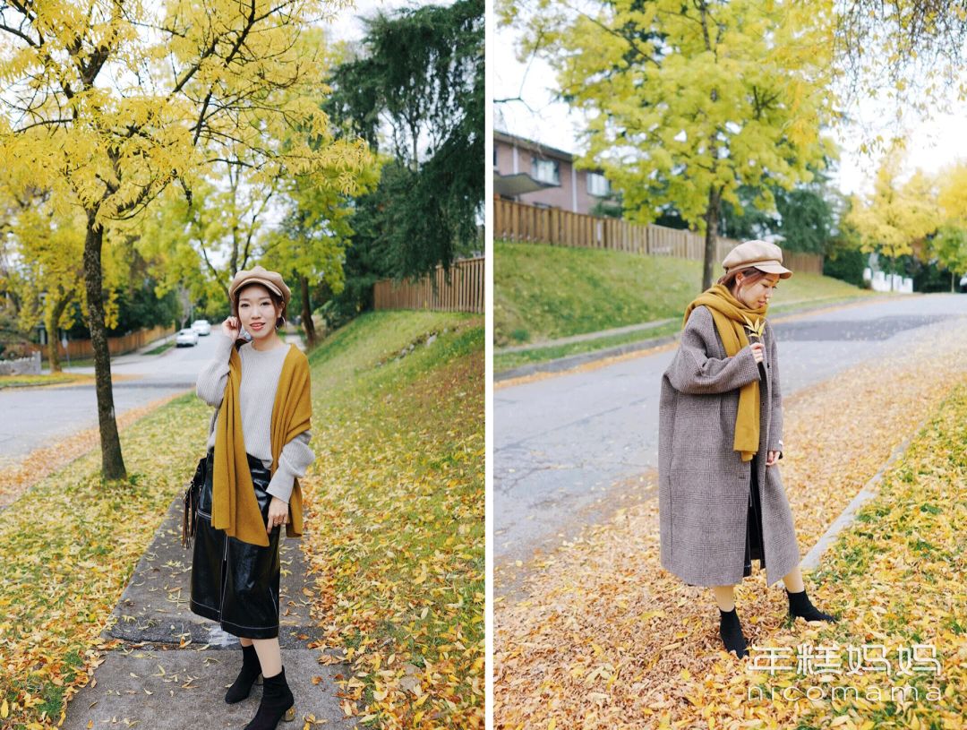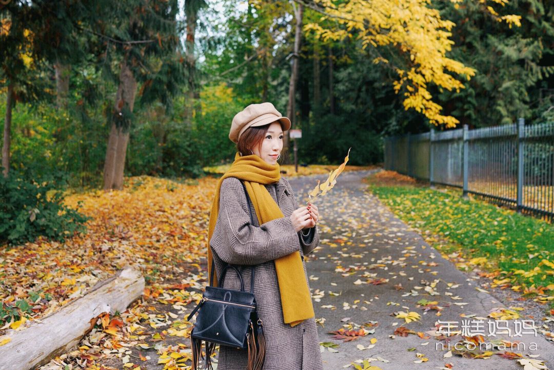 这类照片可以让老公拍拍大全景,让衣服色调和景色一致。比如卡其色外套和地面、围巾和黄叶相呼应,