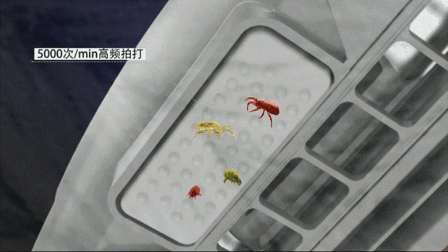 第二步:每分钟5000次高频拍打,螨虫自然震落,然后用超强吸力把灰尘和螨虫一扫而光!