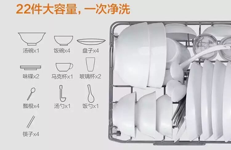 虽然占地小,但洗碗机很能装,一次性能洗22件不同餐具。
